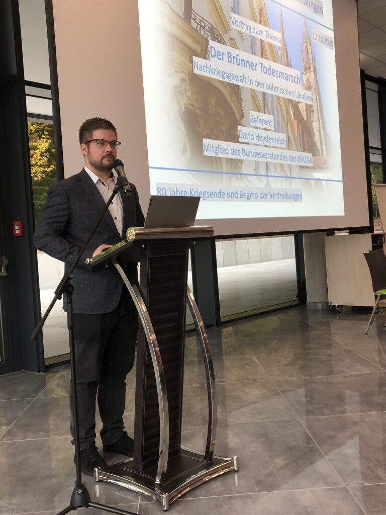 David Heydenreich, M.A. stellte schließlich den Brünner Todesmarsch als Beispiel der Nachkriegsgewalt vor, indem er die Vorgeschichte und Ereignisse um diese Exzesse aufzeigte und der Frage nach den Ursachen nachging. Ausgehend vom Nationalitätenkonflikt seit dem 19. Jahrhundert und der Verschärfung in der Zwischenkriegszeit bis zur Abtretung der Sudetengebiete 1938 und der Errichtung des „Protektorats Böhmen und Mähren“, zu dem auch die Stadt Brünn/Brno gehörte, stellte der Referent die Entwicklung dar, die schließlich in den Tagen ab dem 30.5.1945 zur Zwangsaustreibung der verbliebenen Brünner Deutschen führte. Die Umstände der Vertreibung der ca. 27.000 verbliebenen Brünner Deutschen, darunter v.a. Frauen, Kinder und alte Menschen, bei der ca. 4.200 Menschen starben, wurden anschaulich erklärt. Die vorsätzlichen Tötungen und die Massenvertreibung waren nicht Ausdruck eines spontanen „Volkszorns“, sondern geplant und zweifelsfrei ein Verbrechen gegen die Menschlichkeit. Im Anschluss wurde der Bogen in die Gegenwart gespannt mit einer Präsentation zum diesjährigen Brünner Versöhnungsmarsch, der von meeting.brno anlässlich des 80. Jahrestags des Brünner Todesmarsches schon zum elften Mal durchgeführt wurde und die Begegnung von Deutschen und Tschechen ermöglicht. Dabei wurde auch das große Medienecho verdeutlicht, z.B. mit dem ausführlichen Bericht in der Tagesschau. Das Seminar stieß wie alle Heiligenhof-Seminare in Erinnerung an die Vertreibungsverbrechen auf großes Interesse und löste angeregte Diskussionen aus. Die Seminarteilnehmer betonten, dass besonders die Zeitzeugen ihnen den Zugang zum historischen Geschehen erleichterten. Das galt sowohl für die anwesenden als auch für die in Filmbeiträgen interviewten, die in der Ausstellung dokumentierten und in den Vorträgen zitierten Zeitzeugen, durch welche die Unmenschlichkeit des Vertreibungsgeschehens deutlich wurde.